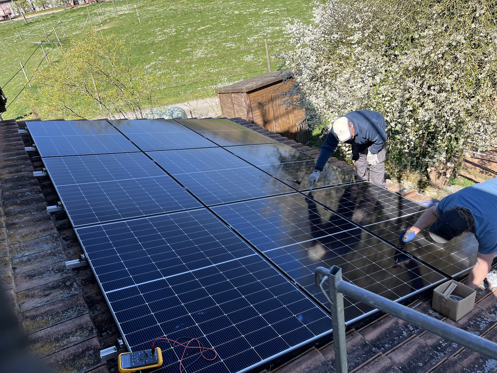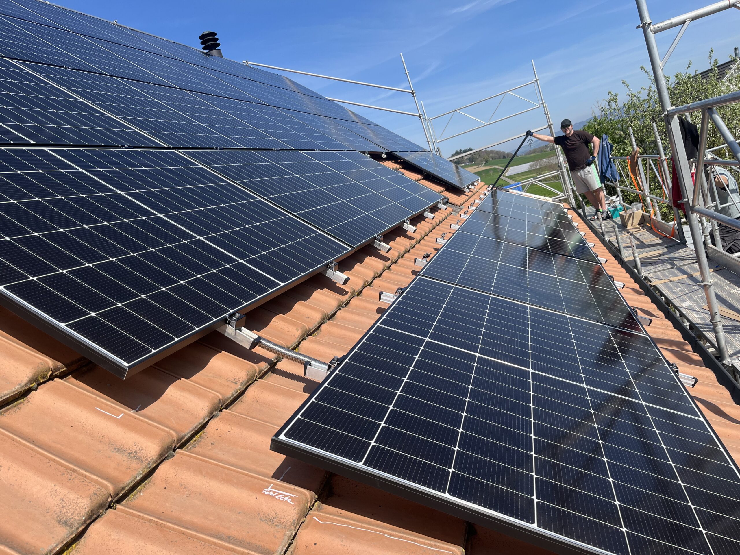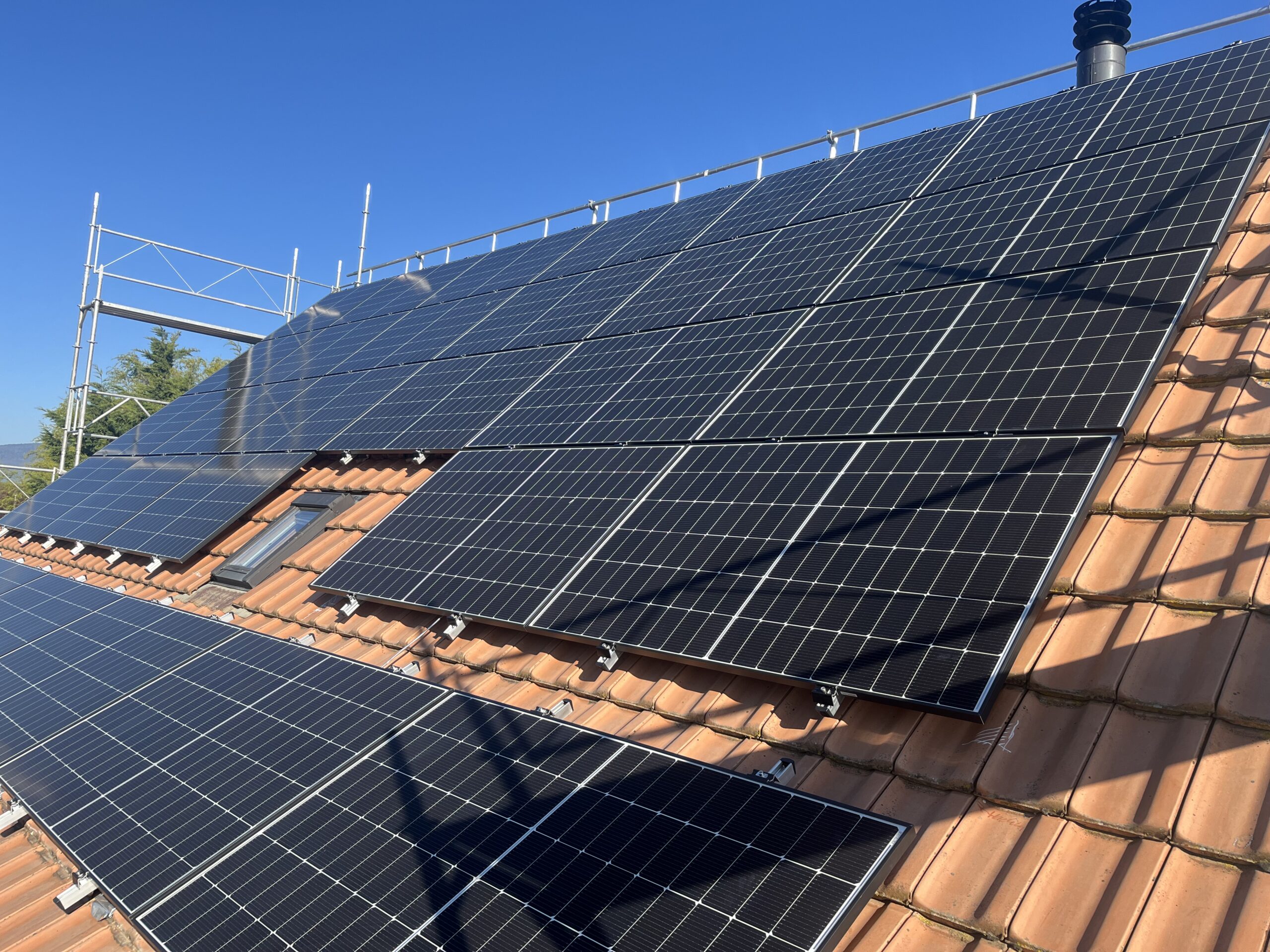 Das nach Süden ausgerichtete Dach mit 60 m² Fläche eignet sich hervorragend für den Bau einer Solaranlage. Bei 44° Neigung ist die Montage anspruchsvoll. Am Knick in der unteren Dachhälfte wurde das Modulfeld aufgesplittet.