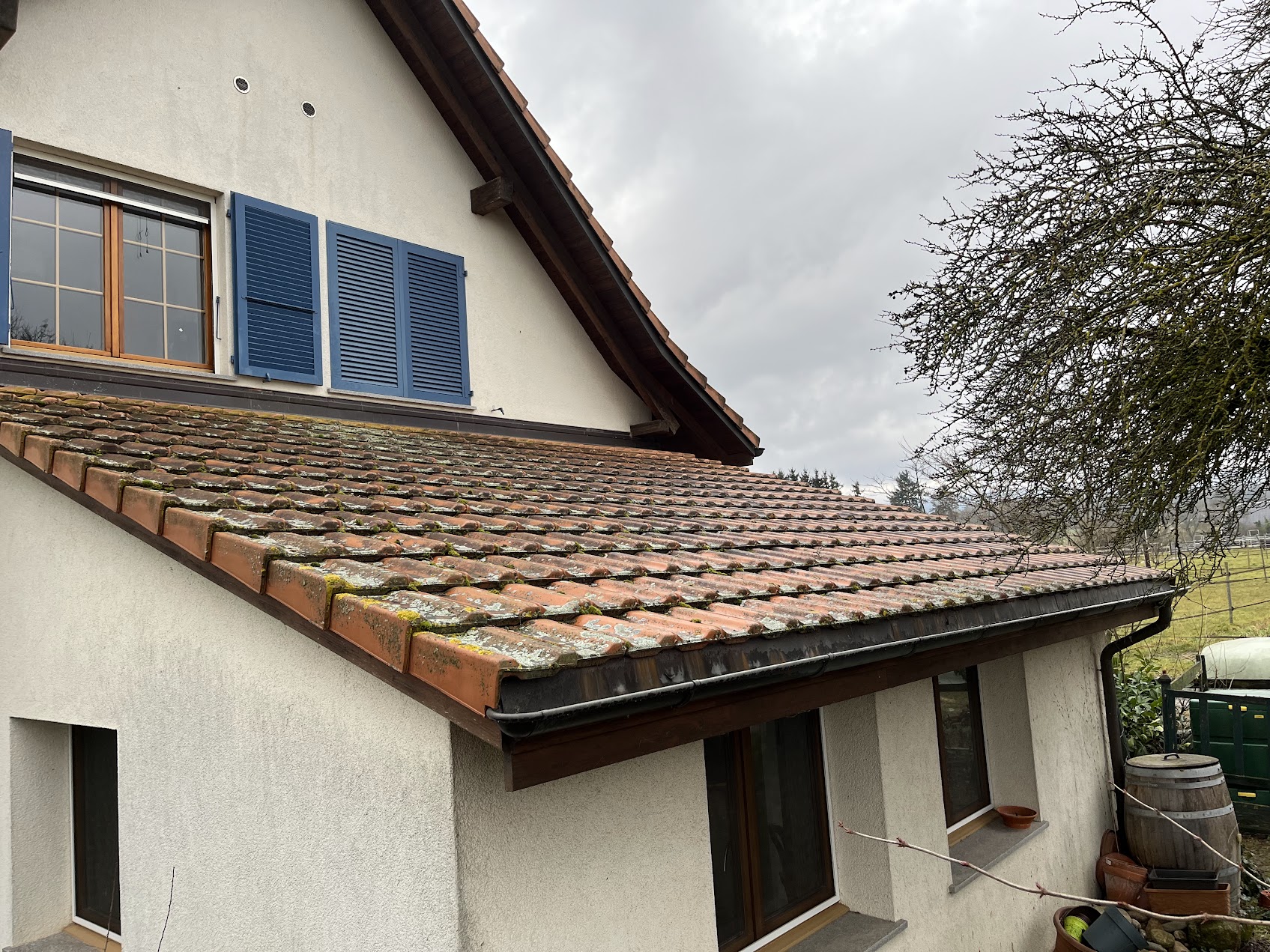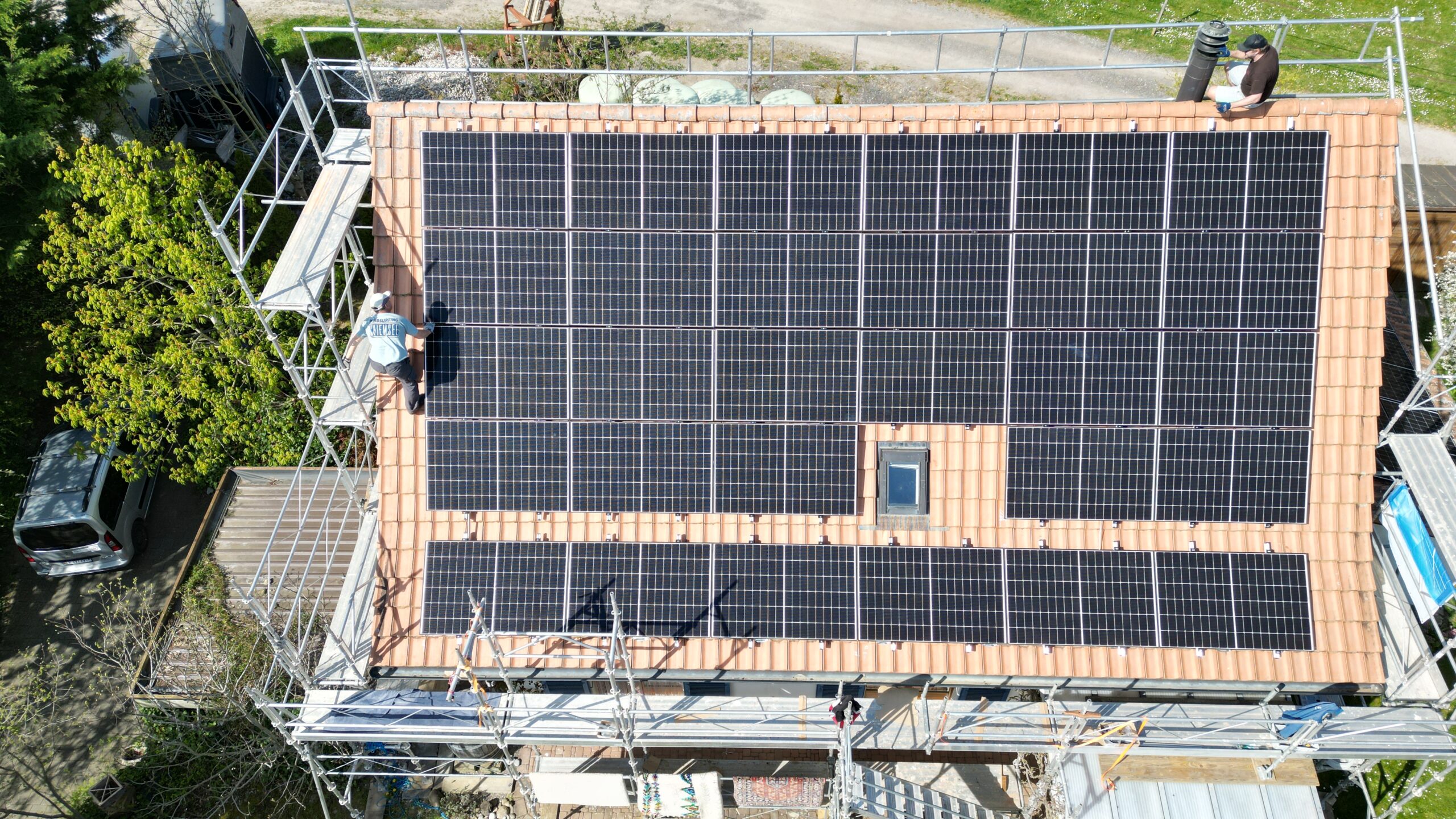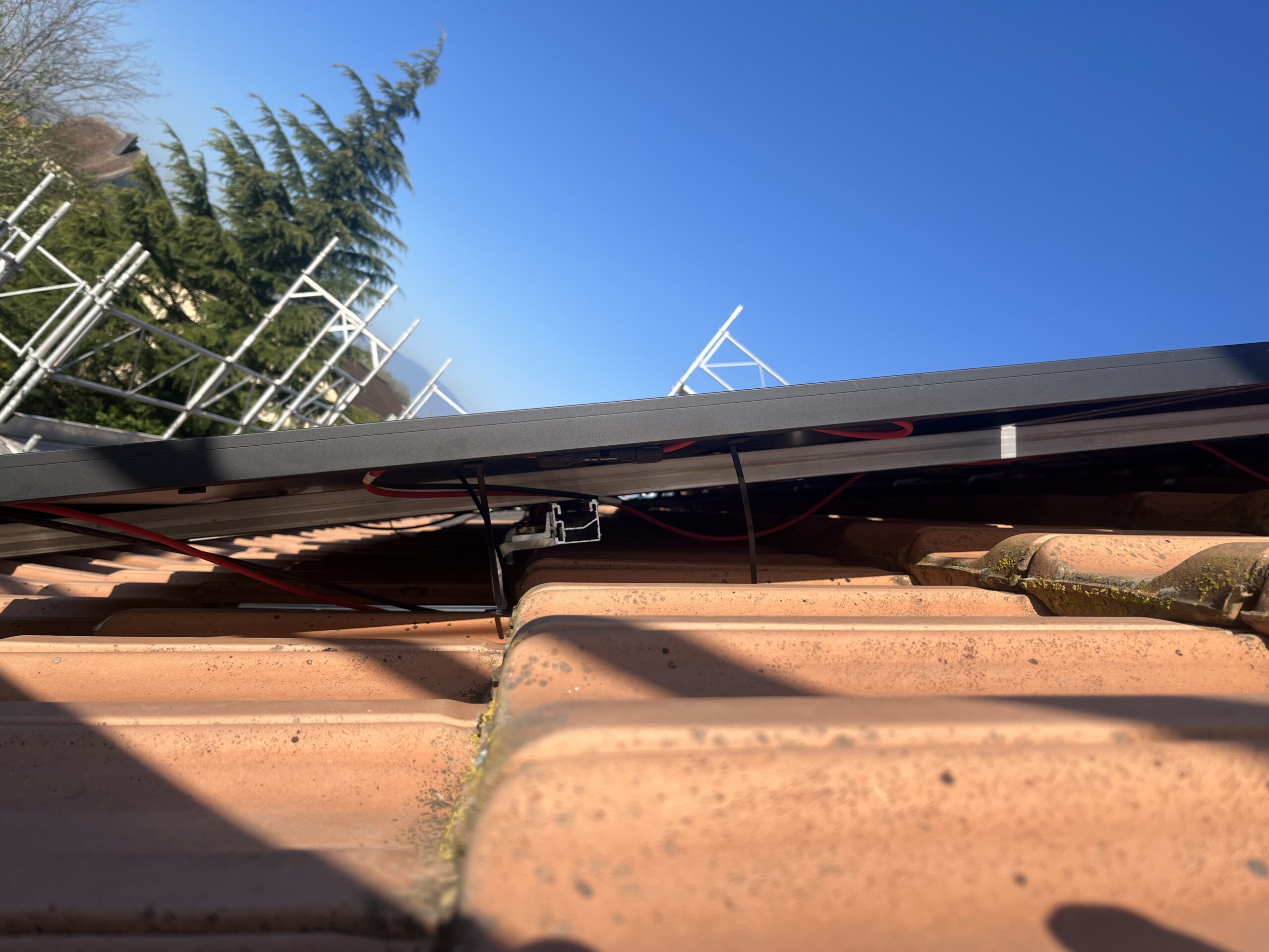 Das nach Süden ausgerichtete Dach mit 60 m² Fläche eignet sich hervorragend für den Bau einer Solaranlage. Bei 44° Neigung ist die Montage anspruchsvoll. Am Knick in der unteren Dachhälfte wurde das Modulfeld aufgesplittet.