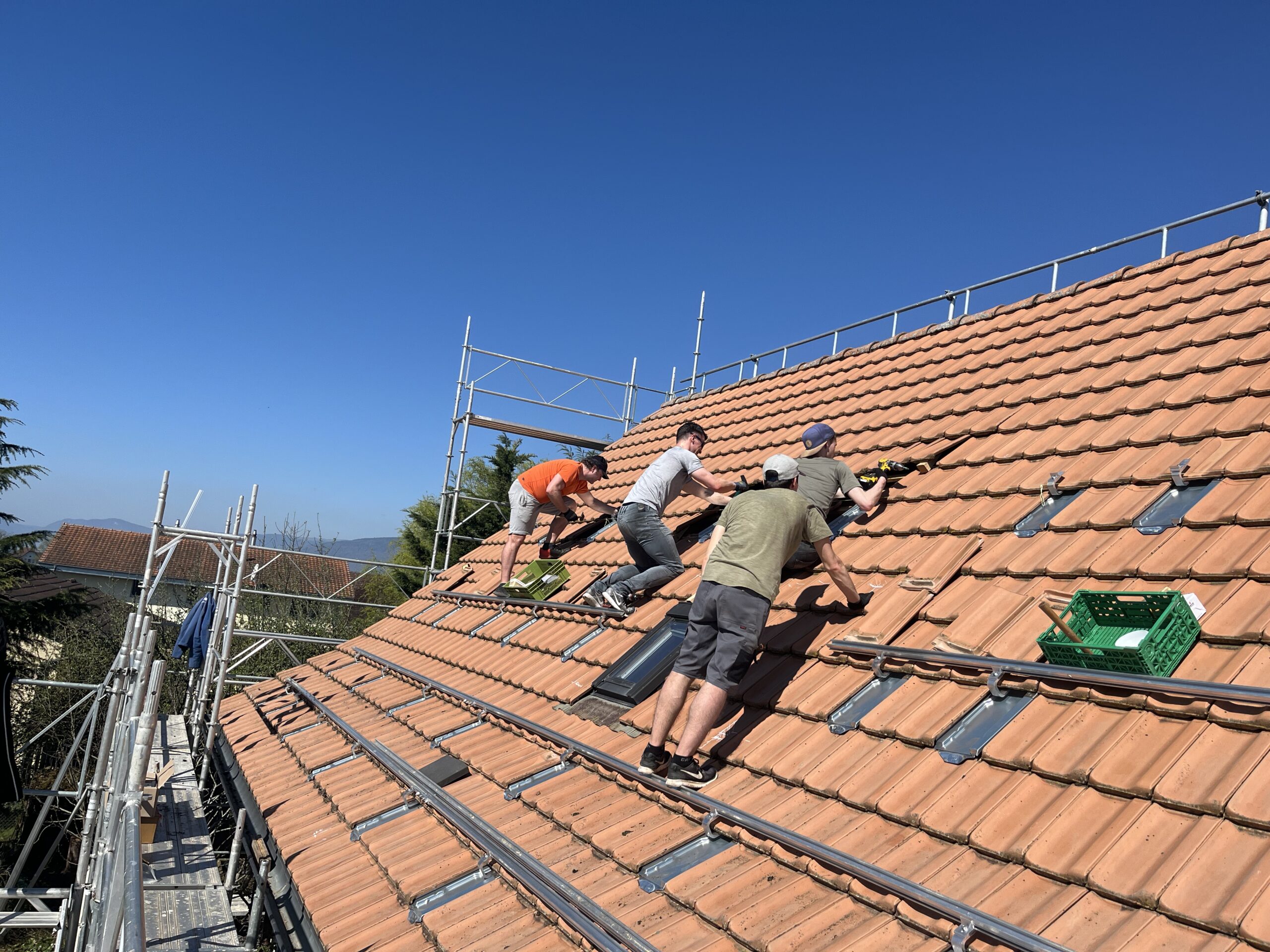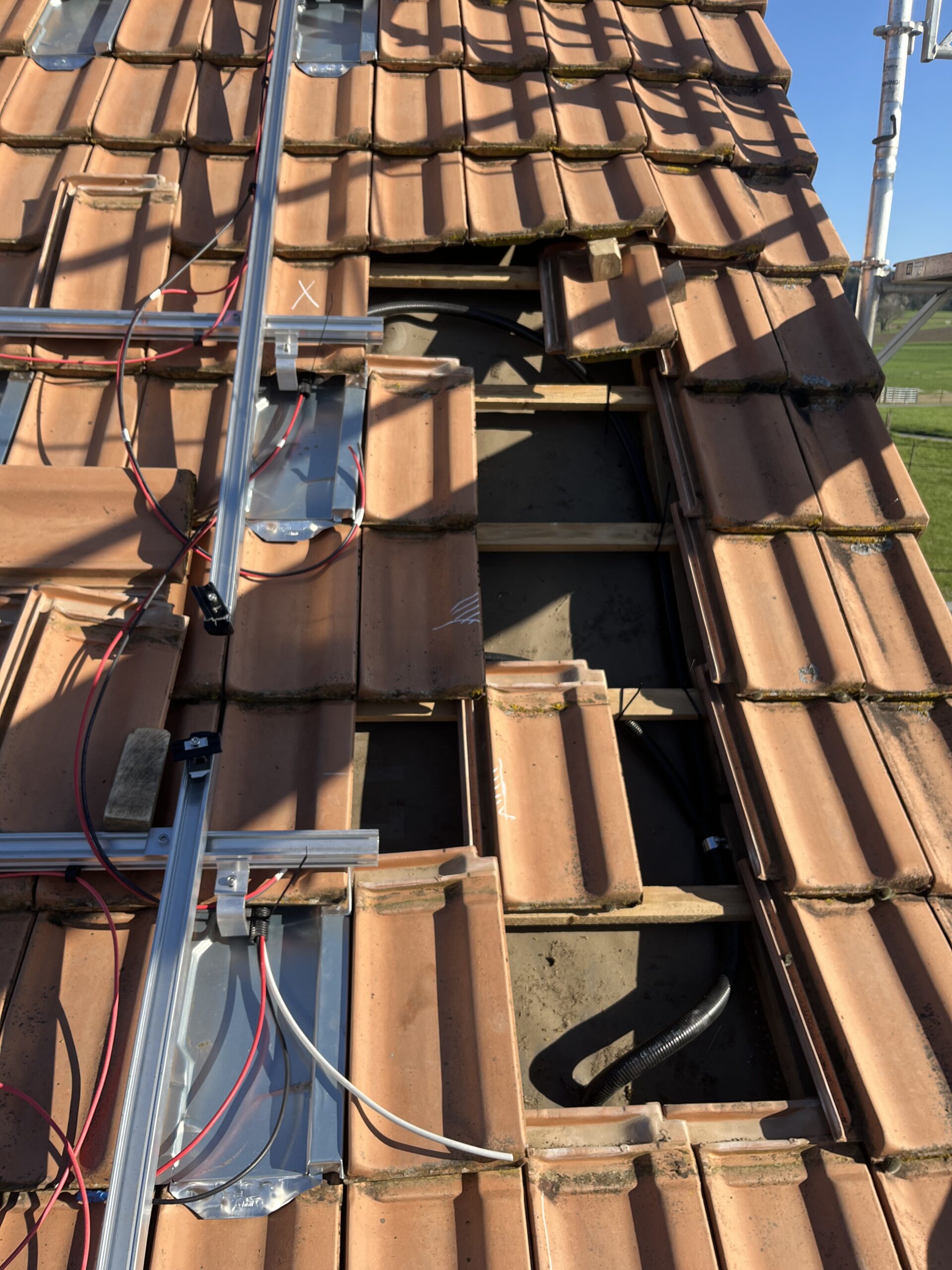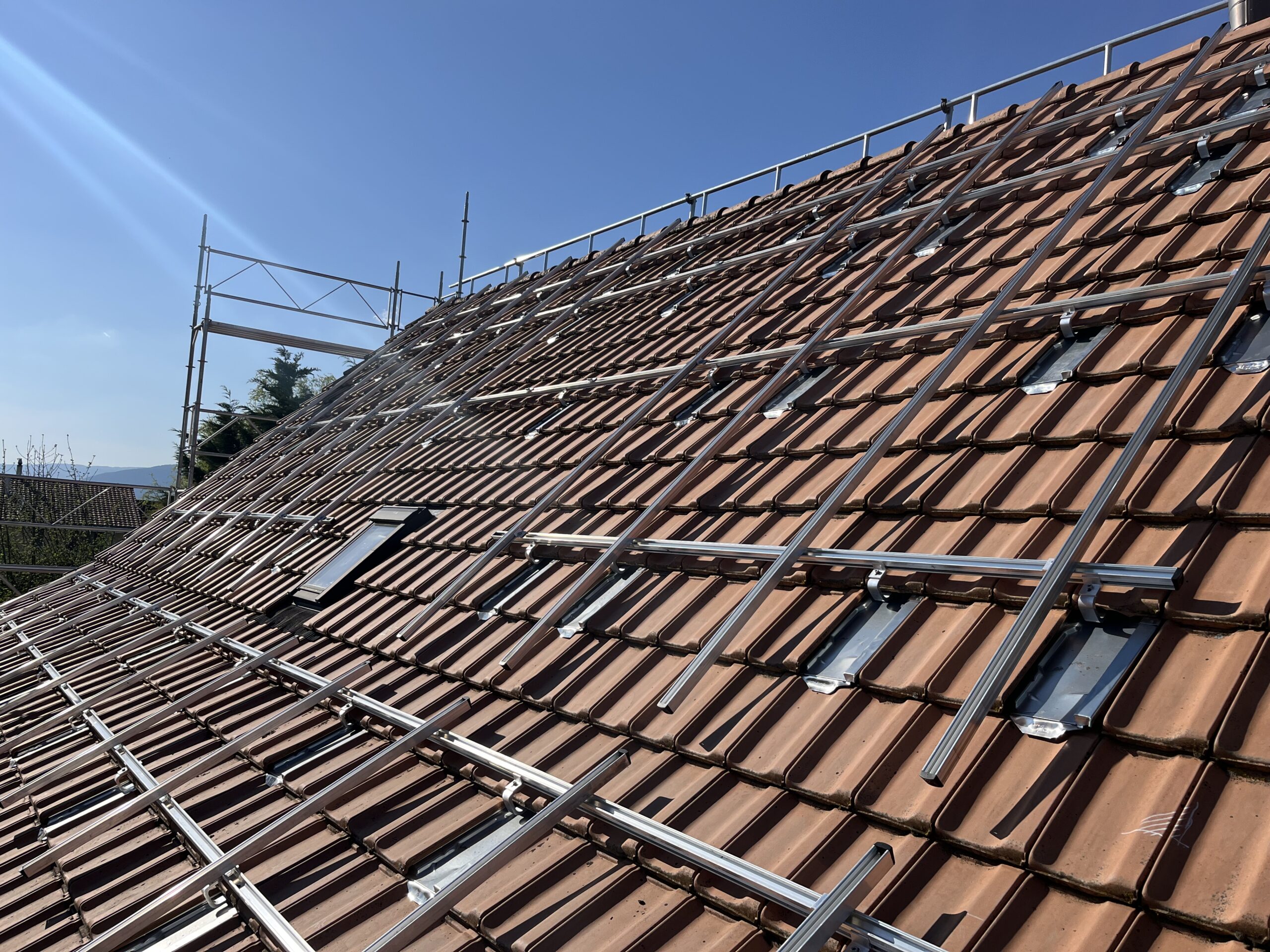 Die Unterkonstruktion besteht aus dem K2 SingleRail System mit Kreuzverbund. Damit die Dachziegel nicht mit der Trennmaschine bearbeitet werden mussten, wurden Blechziegel eingeätzt.