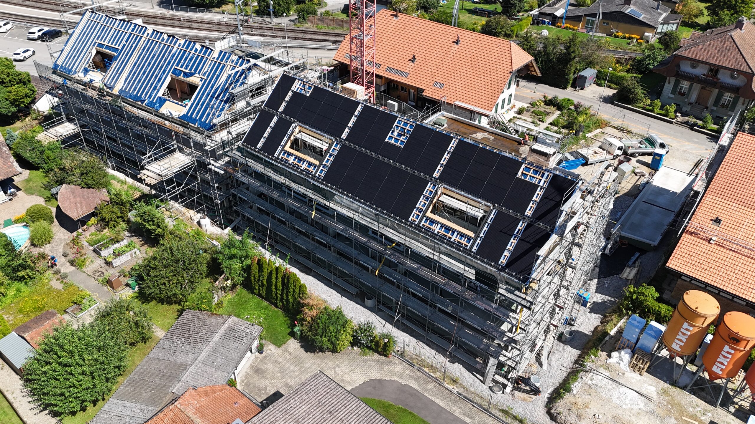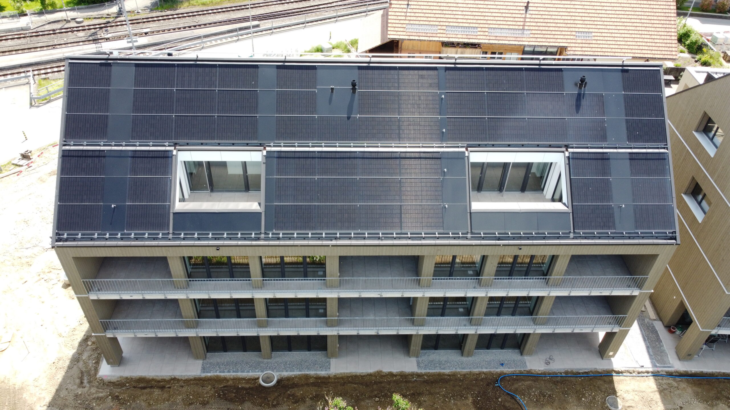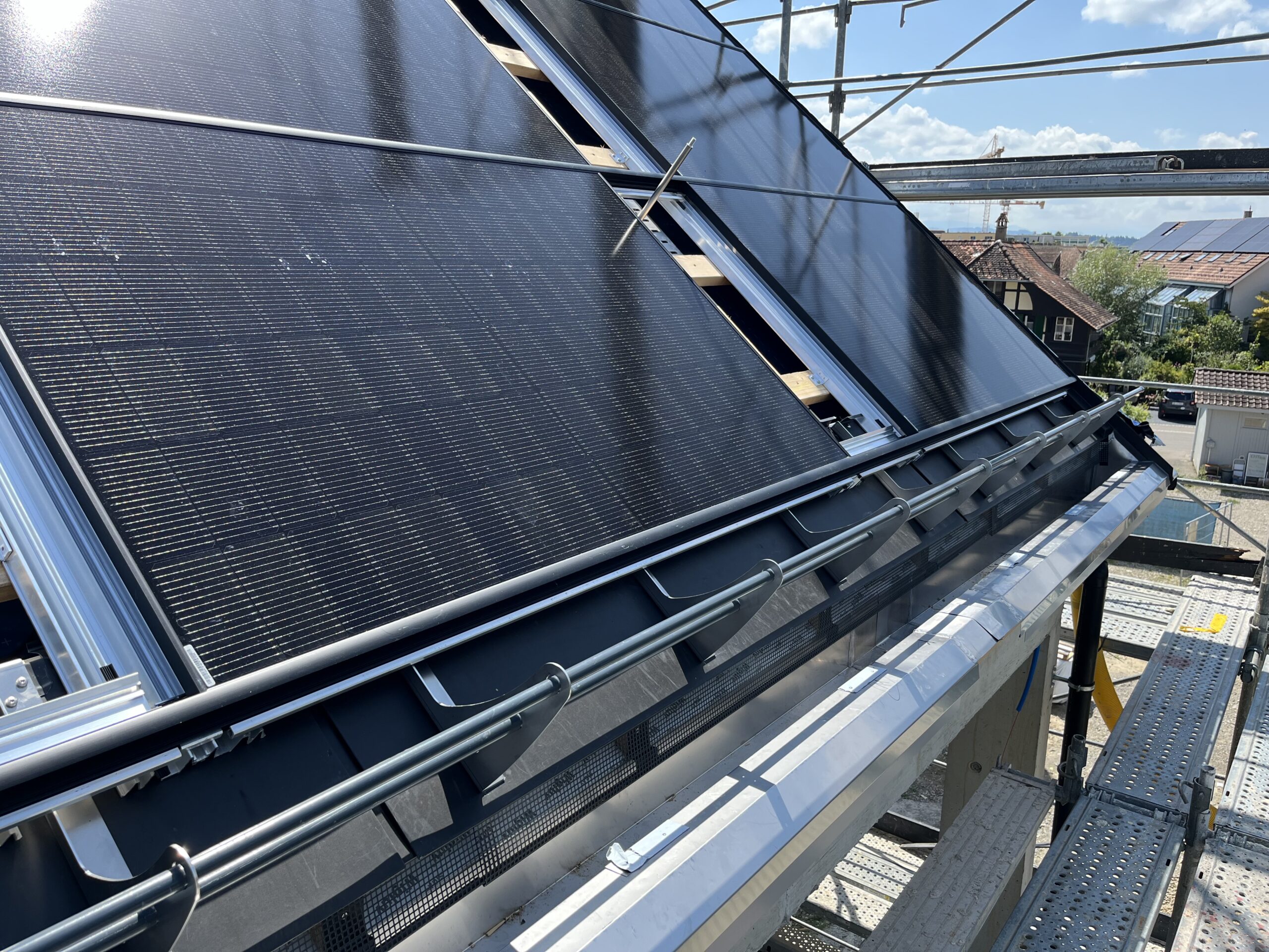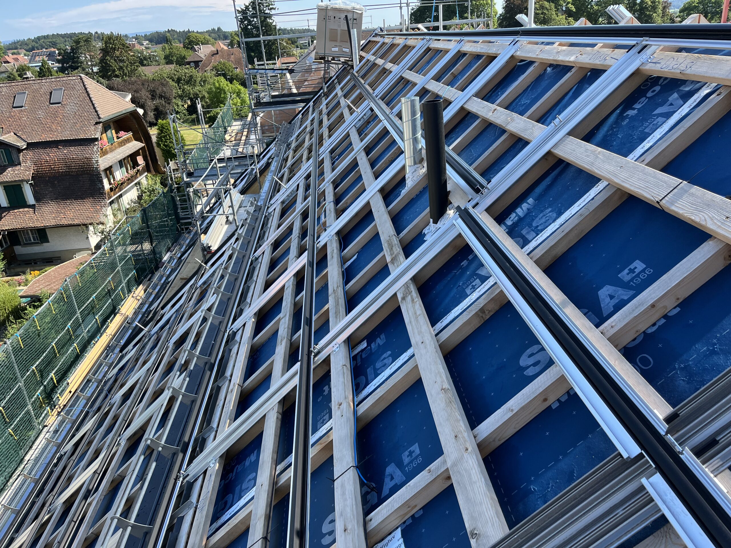 Überbauung in Jegenstorf mit 118 kWp Indach-Anlage. Das Solarstand System bildet eine ästhetische, ebenmässige, flache und gleichmässige Dachfläche. Dachfenster, Lukarnen, Kamine oder Schneefänge können problemlos in die Solaranlage integriert werden.