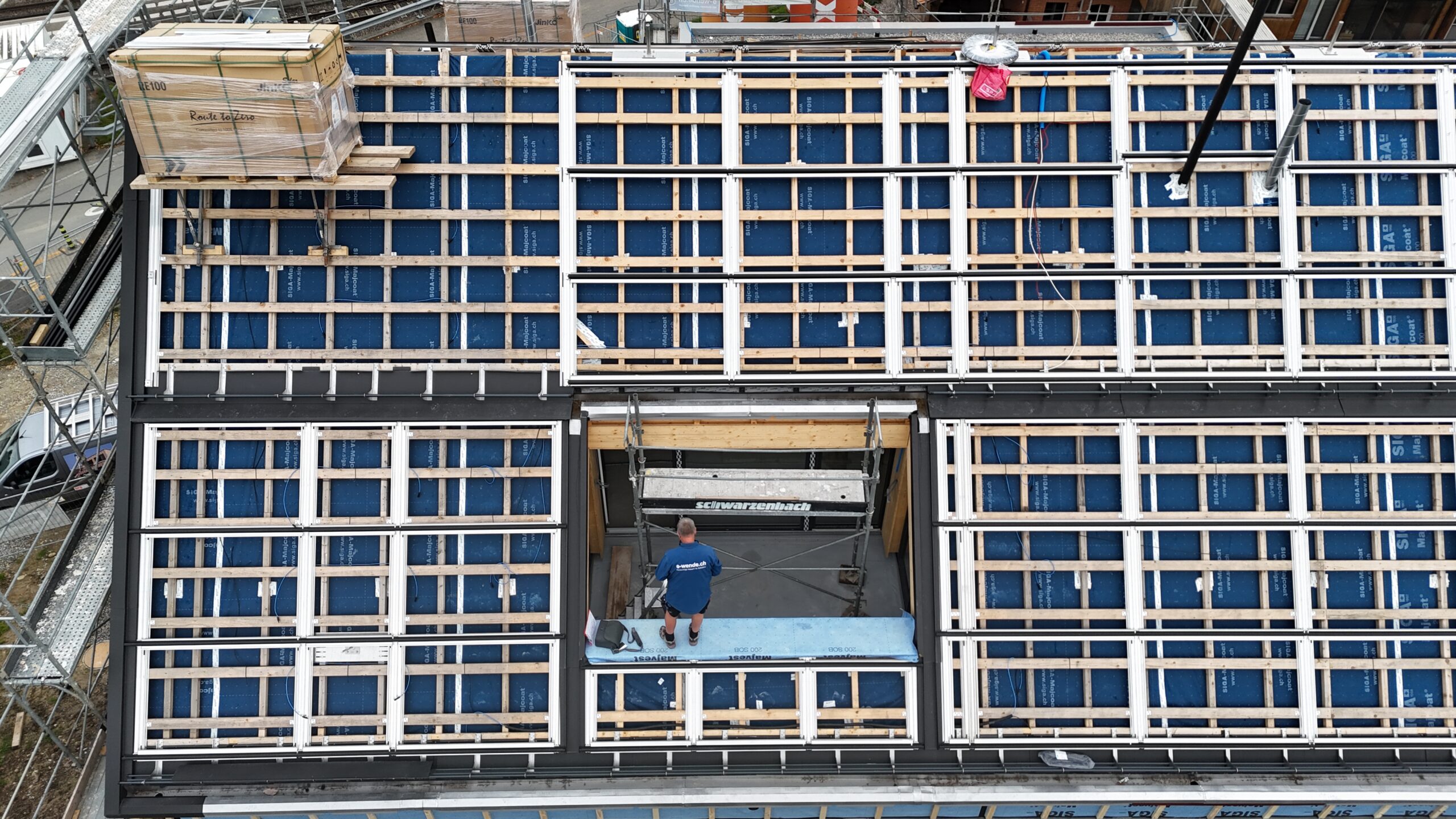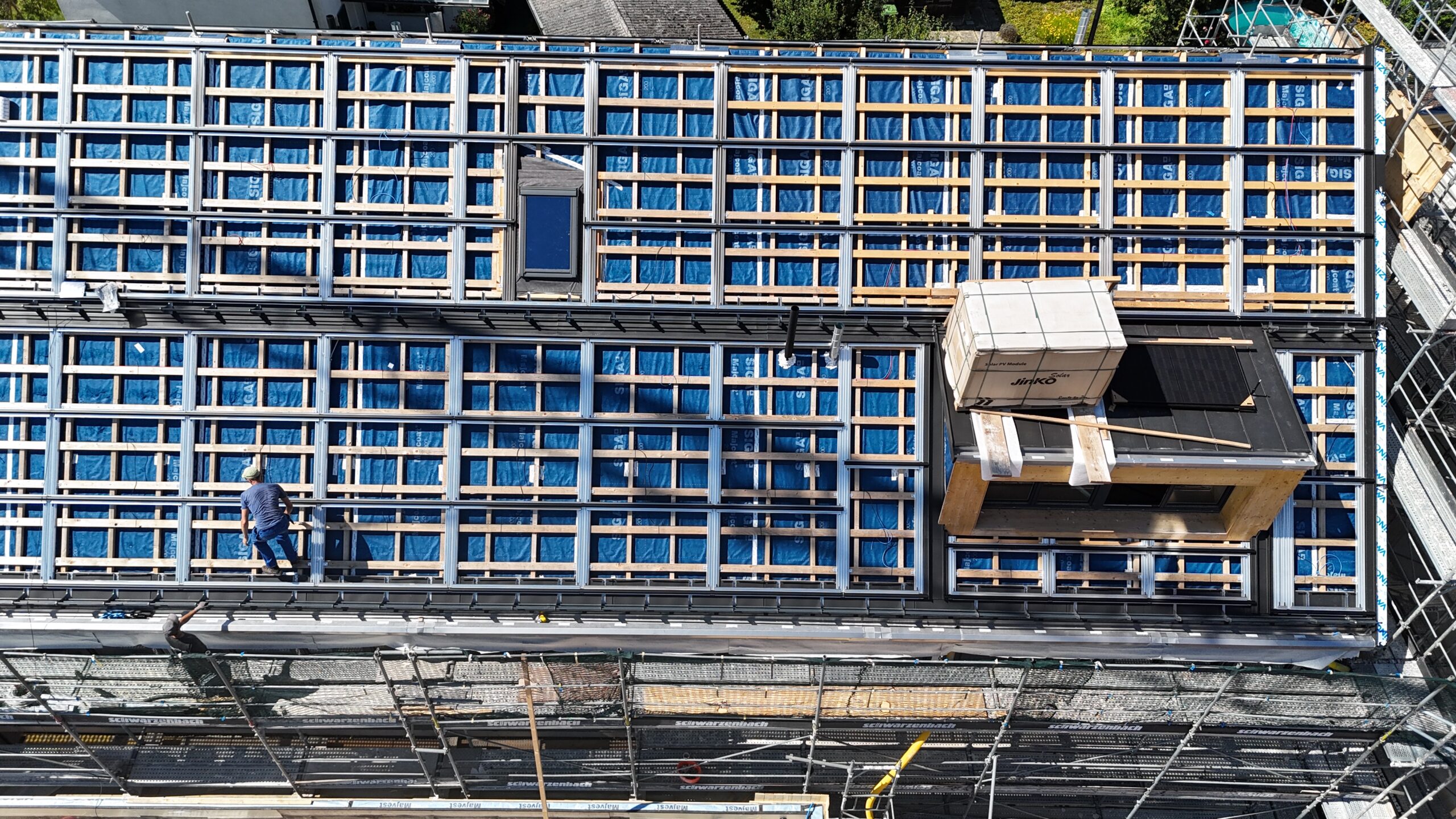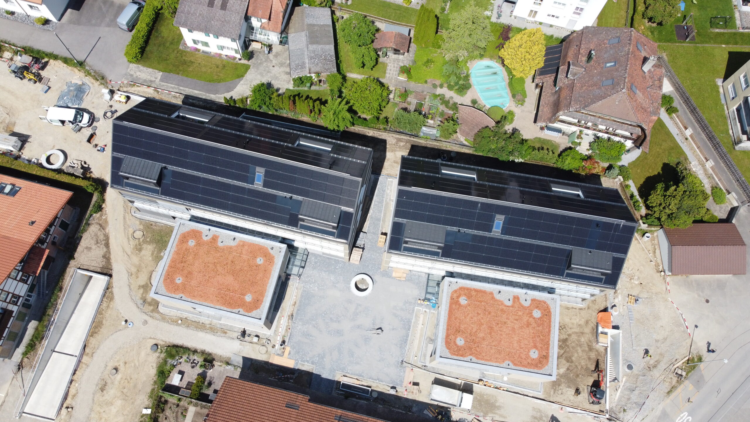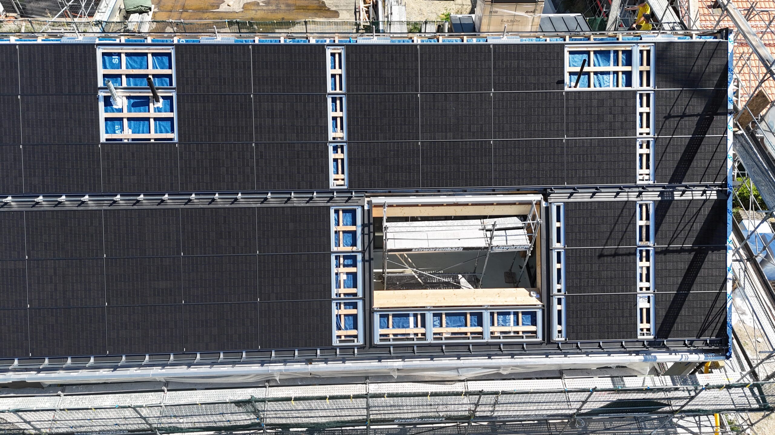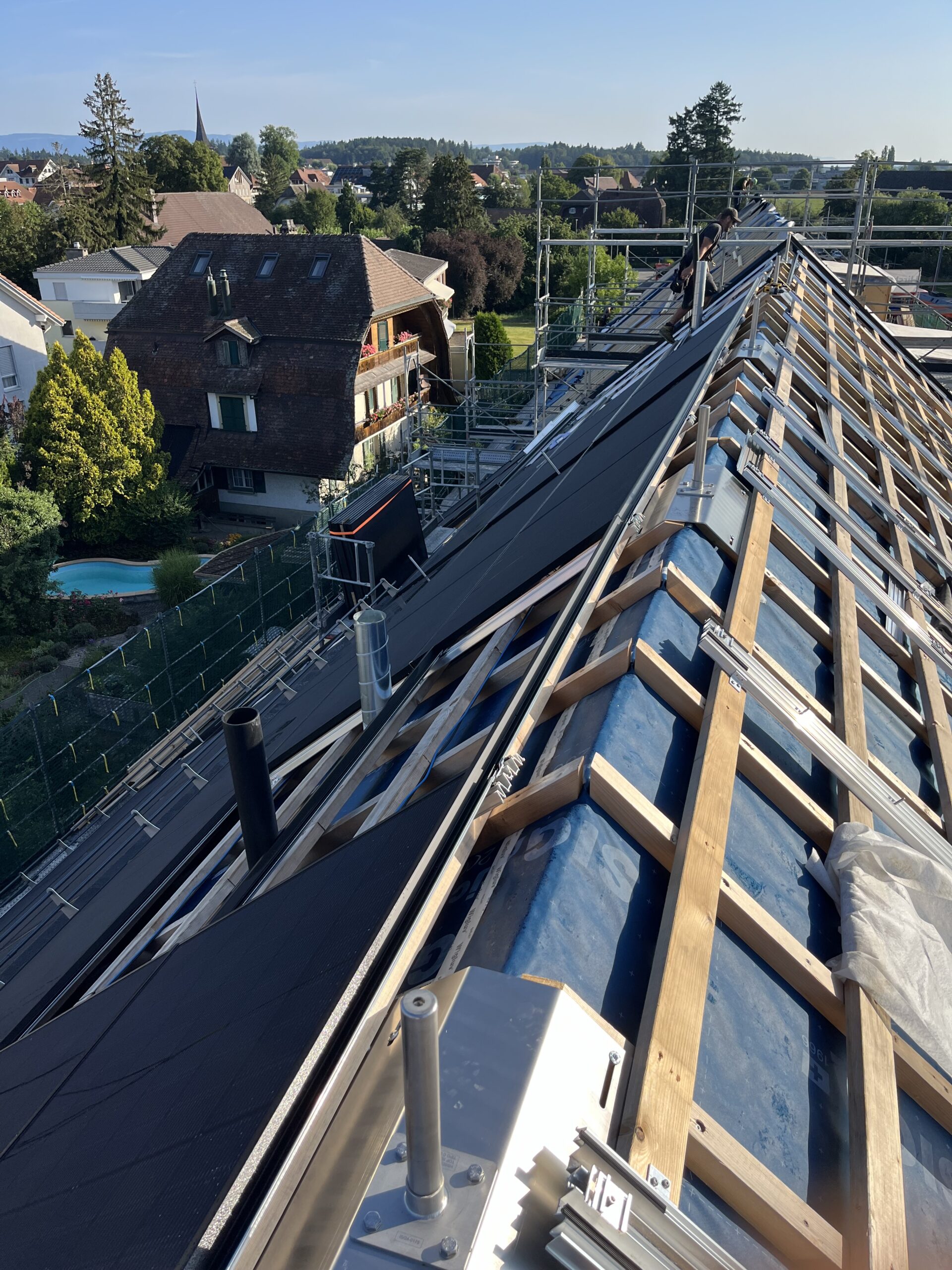 Überbauung in Jegenstorf mit 118 kWp Indach-Anlage. Das Solarstand System bildet eine ästhetische, ebenmässige, flache und gleichmässige Dachfläche. Dachfenster, Lukarnen, Kamine oder Schneefänge können problemlos in die Solaranlage integriert werden.
